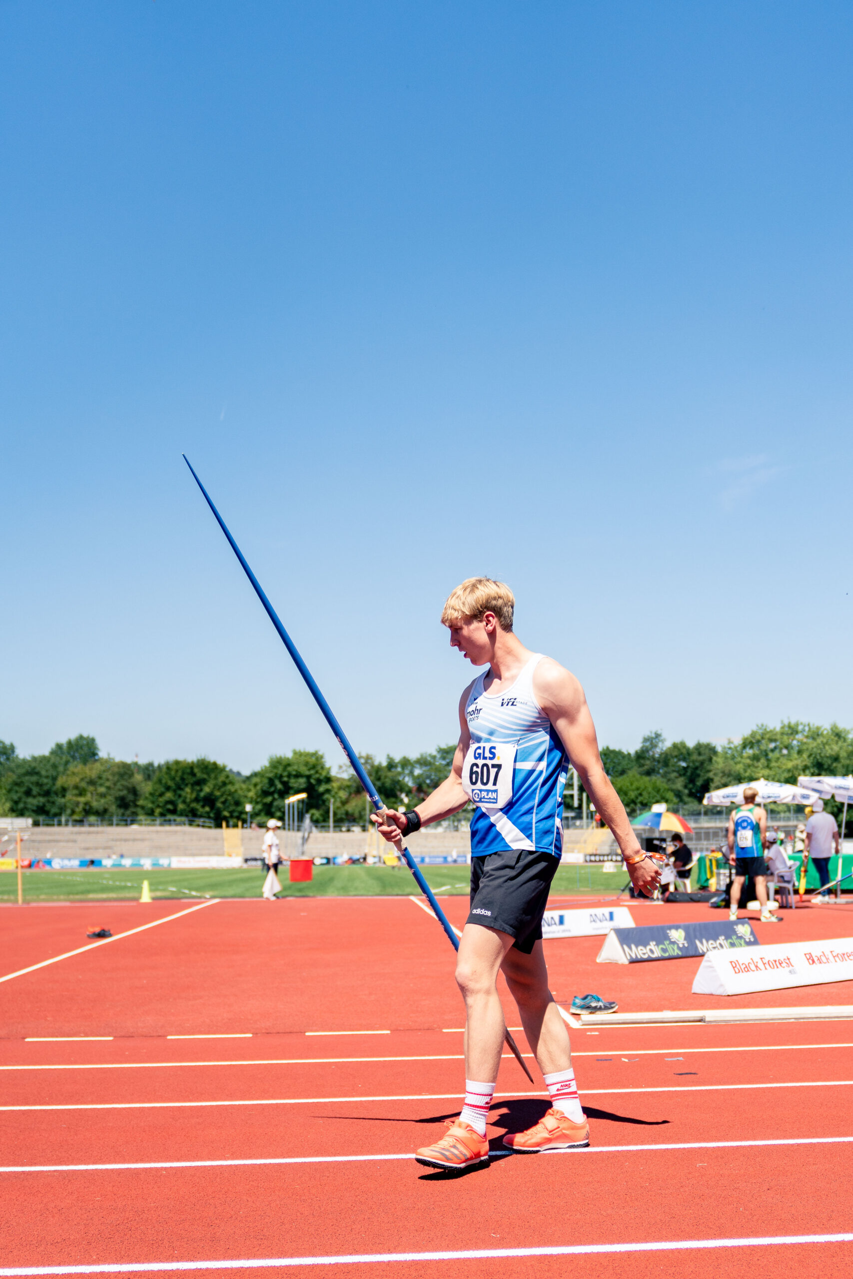Am Sonntag ging dann Bennett Pauli in seiner Paradedisziplin im Speerwurf der Altersklasse U18 ins Rennen. Erklärtes Ziel für ihn und Wurftrainerin Bianca war der Einzug ins Finale. Mit einem sehr guten Wurf von 59,75, knapp unter der persönlichen Bestleistung, konnte er sich auf dem 7. Platz ins Finale katapultieren. Wieder war die Freude in der VfL – Kurve riesig!!! Das Bennett ein Mann des letzten Wurfes ist, haben wir nun schon häufiger festgestellt.