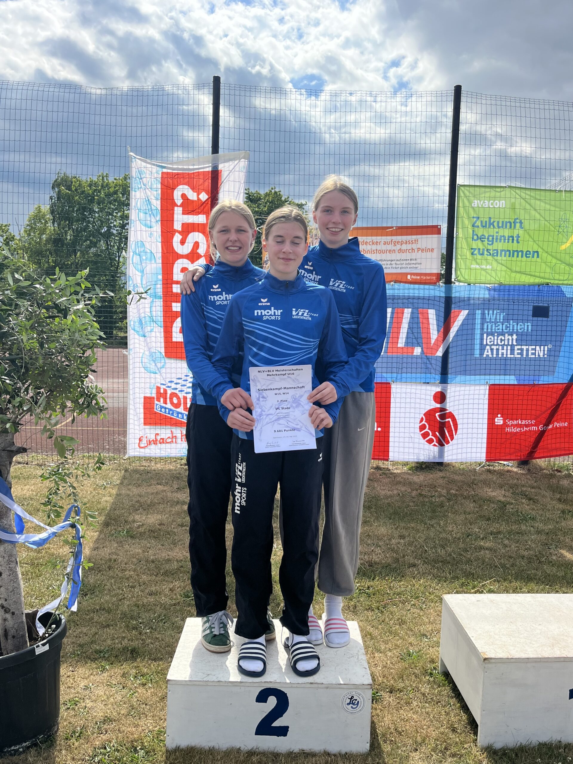 Das Sahnehäubchen war dann die Mannschaftswertung. Fiel das Stader Team bereits zuvor durch seine positive Art und der großen Fairness gegenüber allen Teilnehmern der Landesmeisterschaften auf, so gab es nun auch die sportliche Belohnung. VfL Stade 1 in der Besetzung Greta Pauli, Nike Kluthe-Janssen und Johanna Kleinpeter holte sich Platz 2 in der Mannschaftswertung Siebenkampf und somit die zweite Vize-Landesmeisterschaft! Auch Team VfL Stade 2 kam in die Wertung und belegte Platz 6.