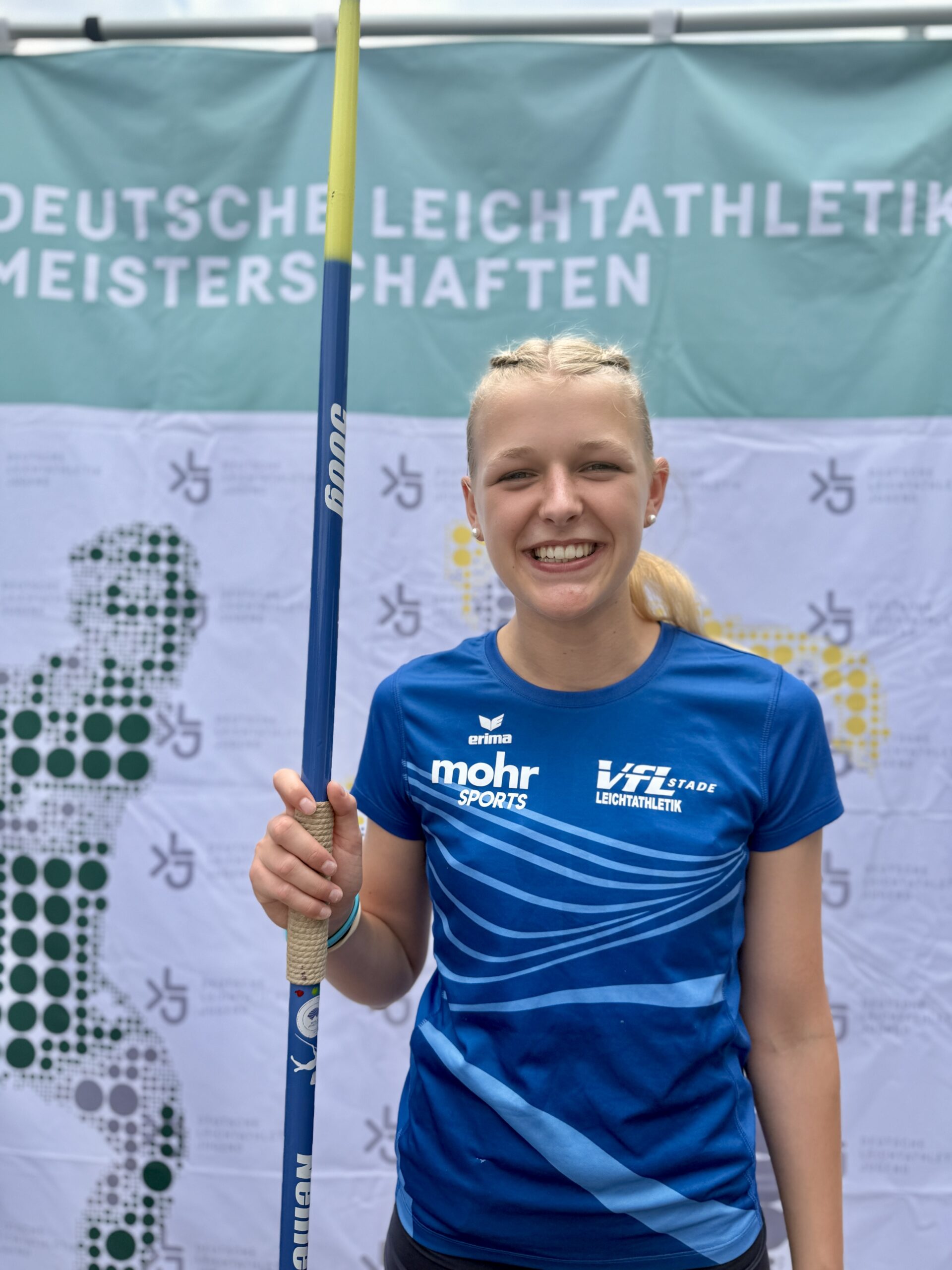 Ulm 6. Juli 2025 – Ein großartiger Moment für Greta Pauli vom VfL Stade: Bei den Deutschen Meisterschaften im traditionsreichen Donaustadion in Ulm lieferte die talentierte Speerwerferin eine beeindruckende Vorstellung ab. Mit einem überragenden Wurf auf 40,42 Meter erzielte sie nicht nur eine neue persönliche Bestleistung, sondern sicherte sich auch einen starken 4. Platz im hochklassig besetzten Teilnehmerfeld der Altersklasse W15.